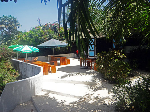 Terrasse du restaurant, très agréable en toutes saisons, accès à la plage par un petit chemin bordé de cocotiers