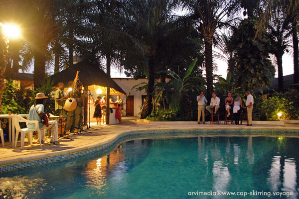 Apéro musical au bord de la piscine, ambiance chaleureuse et amicale à l'hôtel Balafon.