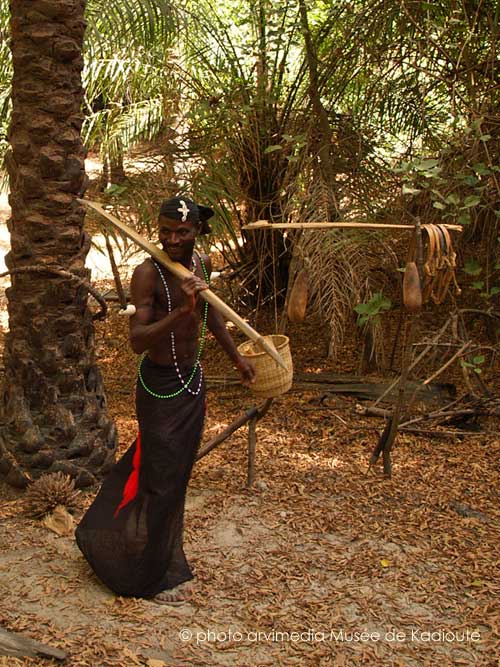 les instruments de musique, les outils servant à la pêche, à la cuisine, les fétiches Africains, les tenues des lutteurs avec les différents pagnes de couleur selon la classe d'âge, le matériel servant à recueillir le vin de palme.
